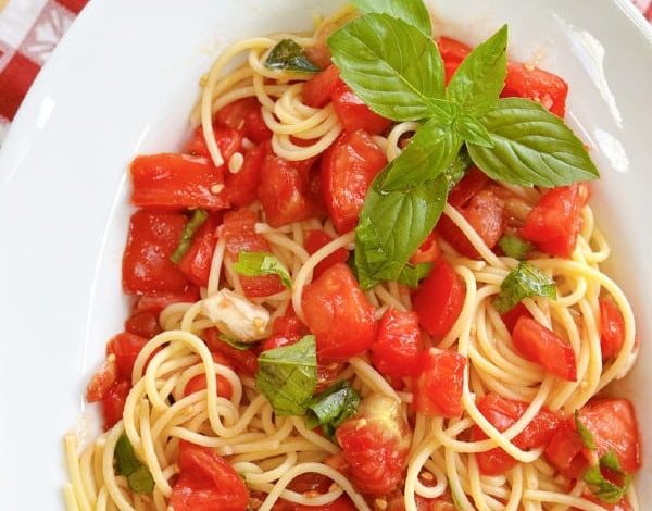 Käes on juuli lõpp ja üle riigi on kuumalaine ning ma ei suuda välja mõelda paremat rooga, mida kuumal ja niiskel päeval serveerida. Spagetid värskete toorete tomatitega tähistavad suvist rikkalikku küpset tomatit viinapuul, seega pole see roog, mida talvel tahaks.